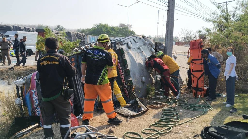 เกือบสลด! รถบัสรับส่งแรงงานเมียนมาร์ 45 ชีวิต เสียหลักพลิกคว่ำตกข้างทาง เจ็บระนาวหน้า “ปิ่นทอง 3” ศรีราชา