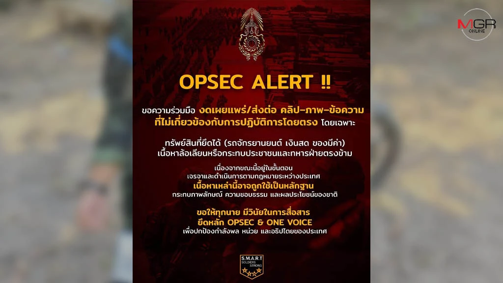 กองทัพเตือน OPSEC งดแพร่ภาพ-ข้อมูลที่ทำให้ไทยเสียเปรียบในเวทีระหว่างประเทศ เช่น ทรัพย์สินที่ยึดได้ เนื้อหาล้อเลียนเยาะเย้ย อาจถูกตีความว่าขัดหลักมนุษยธรรม ชี้การไม่แชร์ ไม่ล้อเลียน ไม่ขยายความเกลียดชัง คือส่วนหนึ่งของการปกป้องประเทศ เช่นเดียวกับการยืนอยู่แนวหน้า