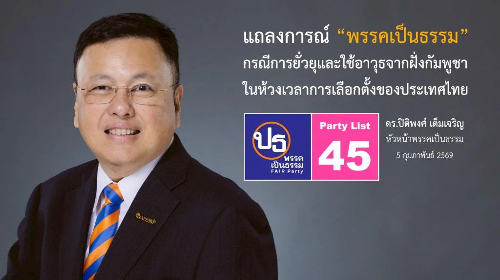 วันนี้(6 ก.พ.) ดร.ปิติพงศ์ เต็มเจริญ หัวหน้าพรรคเป็นธรรม (Party List เบอร์ 45) ออกแถลงการณ์แสดงจุดยืนต่อเหตุการณ์ทหารกัมพูชาใช้อาวุธปืนยิงเข้ามาในเขตราชอาณาจักรไทย ชี้เป็นการละเมิดอธิปไตยและยั่วยุในช่วงเวลาเปราะบางของการเลือกตั้ง พร้อมประกาศหากได้เป็นรัฐบาล จะไม่ยอมให้เหตุการณ์เช่นนี้เกิดขึ้นซ้ำ