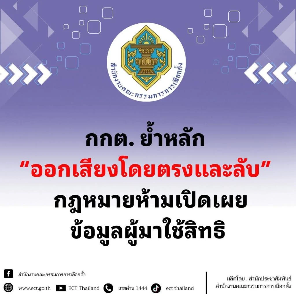 สำนักงาน กกต. ขอยืนยันว่า การเลือกตั้งดำเนินไปภายใต้หลักการออกเสียงโดยตรงและลับทุกขั้นตอนมีมาตรการทางกฎหมายรองรับอย่างชัดเจน เพื่อให้ผู้มีสิทธิเลือกตั้งสามารถใช้สิทธิได้อย่างมั่นใจว่า ข้อมูลและการตัดสินใจของตนได้รับความคุ้มครองตามกฎหมาย