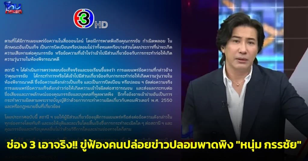 สถานีวิทยุโทรทัศน์ไทยทีวีสีช่อง 3 ร่อนจดหมายชี้แจง กรณีมีการเผยแพร่ข้อความพาดพิง ‘หนุ่ม กรรชัย’ ในลักษณะบิดเบือนว่าเข้าไปมีส่วนเกี่ยวข้องกับการสร้างความวุ่นวายในศาล ย้ำชัดเป็นการกระทำที่ผิดกฎหมายและสร้างความเข้าใจผิดแก่สาธารณชน วอนยุติการส่งต่อข้อมูลเท็จทุกช่องทาง พร้อมสงวนสิทธิ์ดำเนินคดีตาม พ.ร.บ.คอมฯ ให้ถึงที่สุด