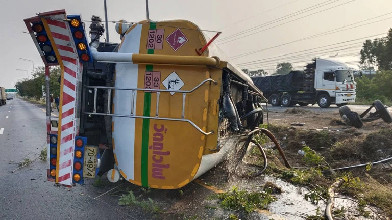 วันนี้ ( 23 มี.ค.69) เมื่อเวลา 07.53น.ตำรวจทางหลวงบ้านส้ม ส.ทล.1 กก.6 อ โนนสูง จ.นครราชสีมา ได้รับแจ้งเกิดอุบัติเหตุรถบรรทุกน้ำมันดีเซล 9,000 ลิตร พลิกคว่ำที่ ถนนมิตรภาพ ขาเข้าจ.ขอนแก่น หลักกิโลเมตรที่ 207-208 ก่อนถึงแยกไฟแดงบ้านวัด ต.เทพาลัย อ.คง จ.นครราชสีมา และมีผู้ได้รับบาดเจ็บ จำนวน 3 ราย จึงรุดไปที่เกิดเหตุ
