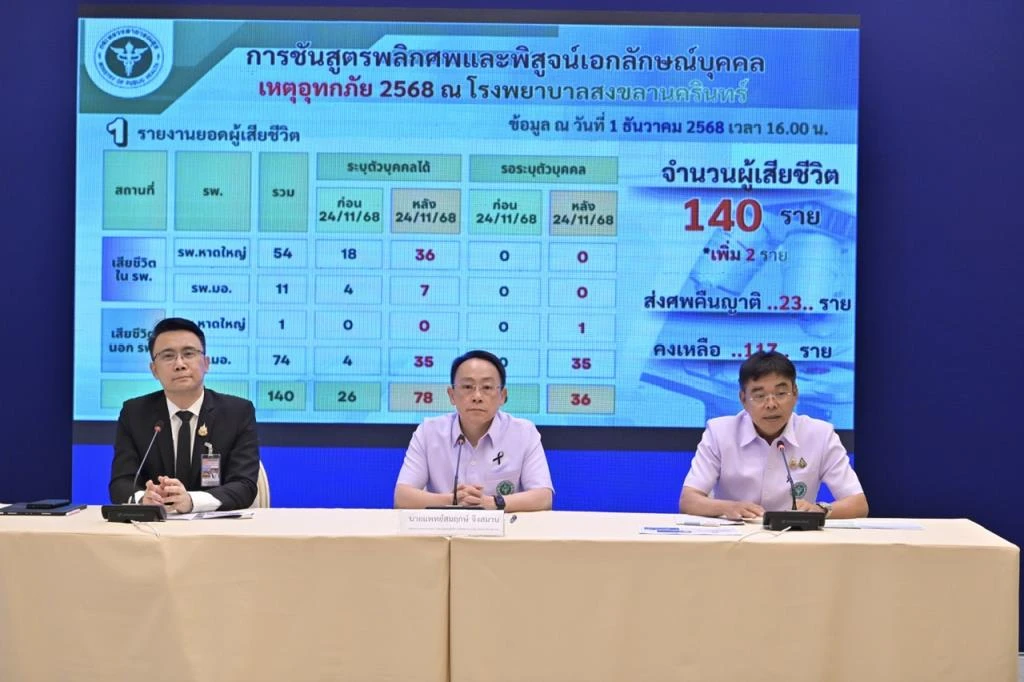 วานนี้ (1 ธันวาคม 2568) ที่ศูนย์ปฏิบัติการแก้ไขสถานการณ์ฉุกเฉินอุทกภัย (ศป.กฉ.) ทำเนียบรัฐบาล นพ.สมฤกษ์ จึงสมาน ปลัดกระทรวงสาธารณสุข พร้อมด้วย นพ.ศักดา อัลภาชน์ รองปลัดกระทรวงสาธารณสุข และ นพ.เอกชัย เพียรศรีวัชรา รองปลัดกระทรวงสาธารณสุข ร่วมแถลงข่าวในประเด็นการดำเนินงานด้านการแพทย์และสาธารณสุขในสถานการณ์อุทกภัยพื้นที่ภาคใต้ ว่า จำนวนผู้เสียชีวิตจากสถานการณ์น้ำท่วม หาดใหญ่ ณ วันที่ 1 ธันวาคม 2568 เวลา 16.00 น. มีทั้งสิ้น 140 ราย ส่วนอีก 7 จังหวัดที่เหลือได้แก่ นครศรีธรรมราช พัทลุง ตรัง สตูล ยะลา ปัตตานี และ นราธิวาส ให้ติดตามตรวจสอบและรายงานเข้ามาในระบบต่อไป