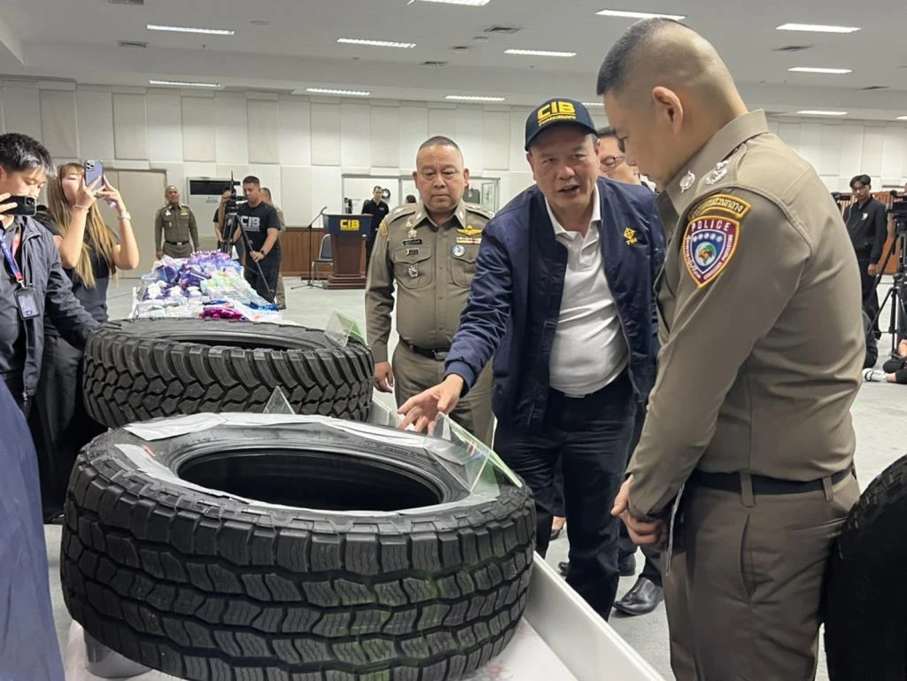 วันนี้ (18 ก.พ.) ที่ กองบัญชาการตำรวจสอบสวนกลาง (บช.ก.) พล.ต.ท.กฤษฎา กาญจนอลงกรณ์ ผู้ช่วย ผบ.ตร. พร้อมด้วย พล.ต.ท.ณัฐศักดิ์ เชาวนาศัย ผบช.ก. พล.ต.ต.คงกฤช เลิศสิทธิกุล ผบก.ปคบ. พ.ต.อ.อนุวัฒน์ รักษ์เจริญ รอง ผบก.ปคบ. พ.ต.อ.ปิยะวัฒน์ ทองอุทัย ผกก.3 บก.ปคบ. นายเอกนิติ รมยานนท์ เลขาธิการสำนักงานมาตรฐานผลิตภัณฑ์อุตสาหกรรม ร่วมกันแถลงผลตรวจค้นโกดังเถื่อนลักลอบย้อมแมวยางเก่าหลอกลวงผู้บริโภค หลังนำกำลังเข้าตรวจสอบโกดังเก็บสินค้า 4 แห่งในพื้นที่ อ.ศรีราชา จ.ชลบุรี ตรวจยึดยางรถยนต์ไม่ได้มาตรฐานจำนวนกว่า 2 พันเส้นมูลค่า 10 ล้าน