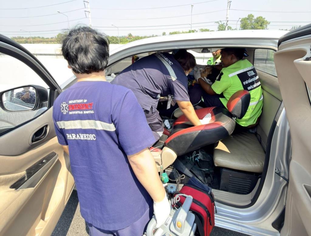 เมื่อเจ้าหน้าที่กู้ภัยฯ มาถึงที่เกิดเหตุ พบว่าที่บนกลางสะพาน ในช่องเลนขวาสุด พบรถกระบะนิสสัน นาวาร่า สีเทาหมายเลขทะเบียน 2ฒร -4911 กรุงเทพมหานคร จอดดับเครื่องอยู่ โดยที่เบาะคนขับ พบร่างผู้ได้รับบาดเจ็บ นอนหมดสติ โดยมีเหล็กฉากขนาด 2 นิ้ว ยาวประมาณ 1 เมตร เสียบคาอยู่ที่หน้าท้องคนขับอยู่ ทางเจ้าหน้าที่กู้ภัย ได้พยายามที่จะทำการช่วยเหลือ และทำ CPR แต่ไม่เป็นผล พบว่าคนขับได้เสียชีวิตแล้ว จึงประสานให้ทางเจ้าหน้าที่ตำรวจและแพทย์จากสถาบันนิติวิทยาศาสตร์ กระทรวงยุติธรรม รุดมาตรวจสอบ