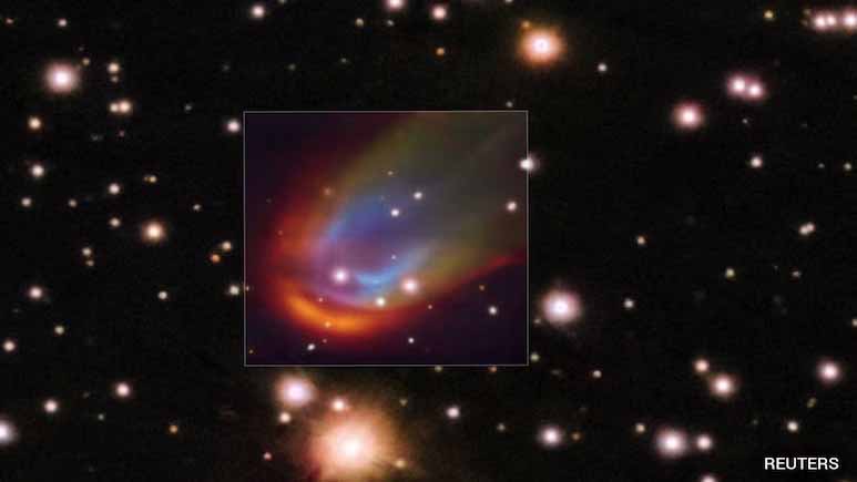 The shockwave – more specifically a bow shock – caused by the white dwarf was observed using the European Southern Observatory’s Chile-based Very Large Telescope. The shockwave was seen in an image released by the scientists glowing in various colors produced when material flowing outward from the white dwarf collided with interstellar gas.