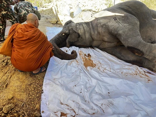 วันนี้ (4 ก.พ.) ที่อุทยานแห่งชาติภูเวียง อำเภอเวียงเก่า จังวัดขอนแก่น หลังจากทีมสัตวแพทย์ ผ่าชันสูตรช้างสีดอหูพับ ช้างเพศผู้อายุประมาณ 15 ปี ช้างป่าภูหลวง ล้มขณะกำลังลำเลียงใส่รถบรรทุกสิบล้อ เพื่อนำไปยังจังหวัดเลย หลังจากเจ้าหน้าที่ยิงยาซึม และเคลื่อนย้ายขึ้นบนรถบรรทุกสิบล้อ โดยพระสงฆ์ได้ทำพิธีอุทิศส่วนกุศล และพิธีขอขมา มีนายยุทธนา โพธิวิหค รองผู้ว่าราชการจังหวัดขอนแก่น, นายณัฐวัฒน์ นุ้ยศรีราม ผู้อำนวยสำนักบริการพื้นที่อนุรักษ์ที่ 8 (ขอนแก่น) และเจ้าหน้าที่ที่เกี่ยวข้อง ร่วมในพิธี